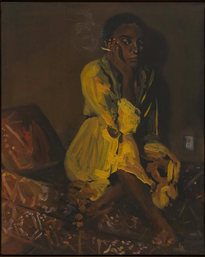 In pensive, cinematic portraits, painter Danielle Mckinney (b. 1981; Montgomery, AL) captures solitary female protagonists in moments of leisure and respite. Set in dream-like domestic interiors, Mckinney's figures sprawl across unmade beds, lounge in overstuffed armchairs, and splay on the floor in various states of undress. They smoke, read, and nap; immersed in their own worlds, ensconced in their own space, these women are consumed with rest, with pleasure, with leisure, with being. Hinting subtly at the busy routine of these figures' lives, Mckinney withholds their motivations, their thoughts, their comings and goings—in turn captivating viewers with narratives implied in elusive shadows and revealing details.